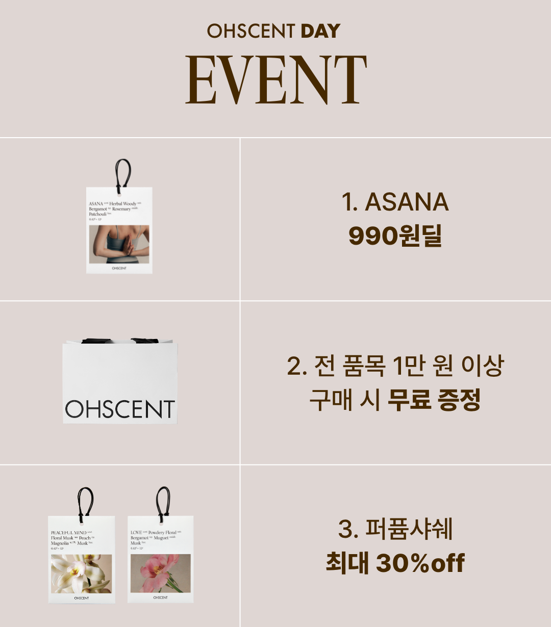 오센트데이를 맞아 준비한 아사나 퍼퓸샤쉐 990원 딜부터 전 품목 1만 원 이상 구매 시 아사나 퍼퓸샤쉐 무료 증정 혜택까지, 지금 오센트에서만 만날 수 있는 특별한 향기 가득한 선물을 놓치지 마세요.